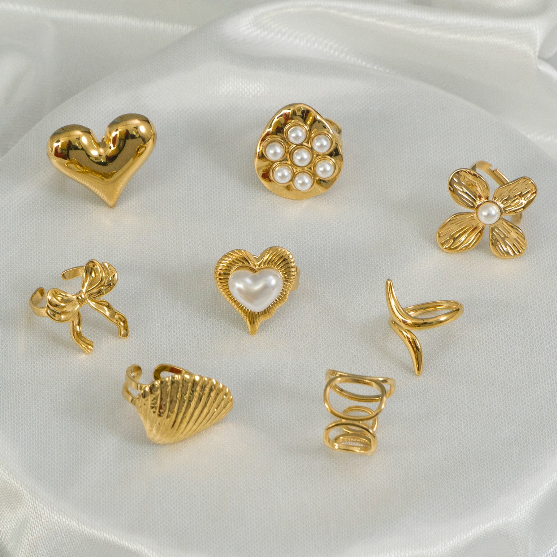 Elevate your accessory collection with this stunning set of 7 adjustable gold-tone rings, each featuring a unique artistic design. From abstract shapes to floral and heart motifs, these rings are perfect for mixing, matching, and layering. Crafted for style and comfort, they offer a versatile fit for any finger size.