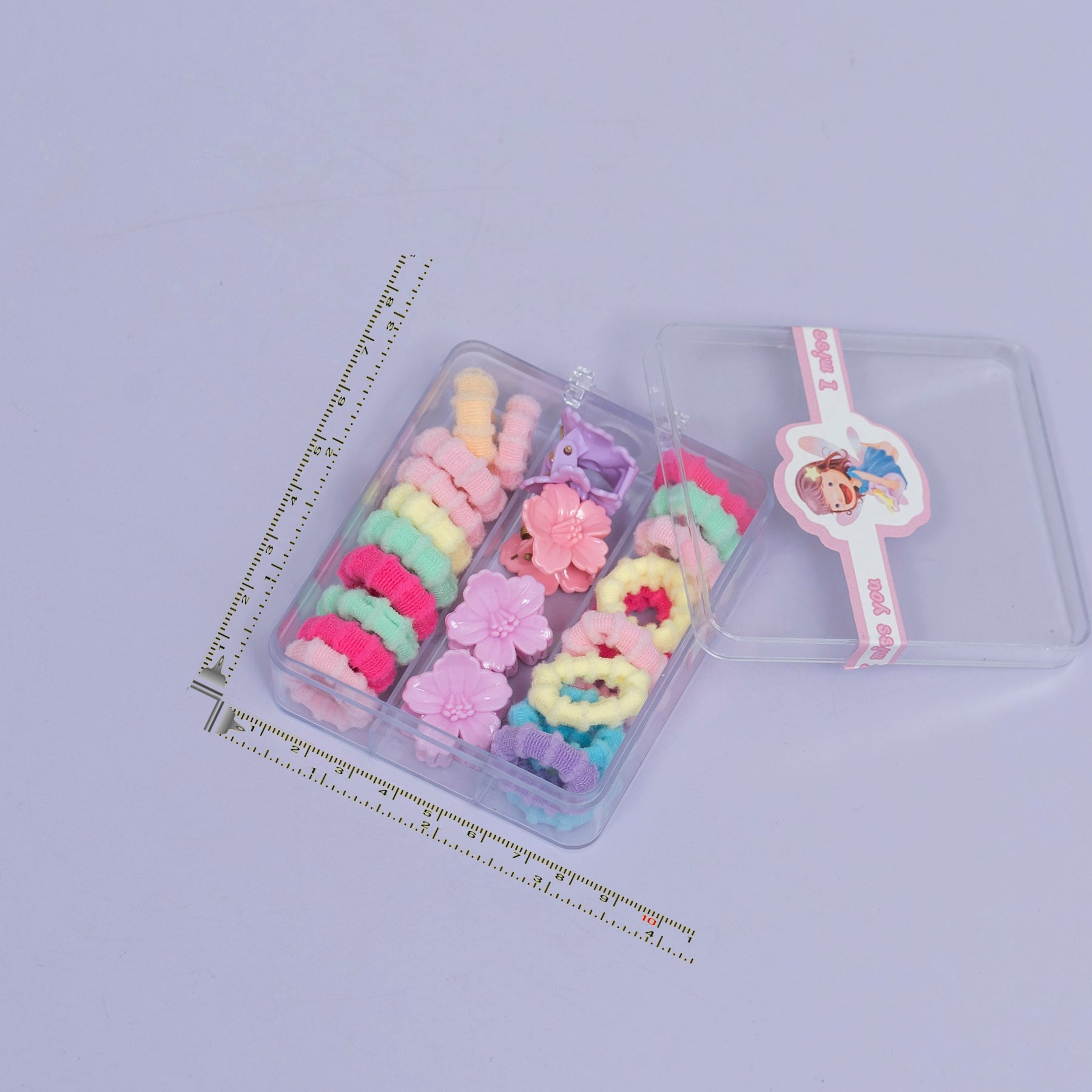 A cute and compact organizer box filled with colorful mini hair ties, soft scrunchies, and flower clips for kids. Perfect for daily styling and easy storage in one adorable box.