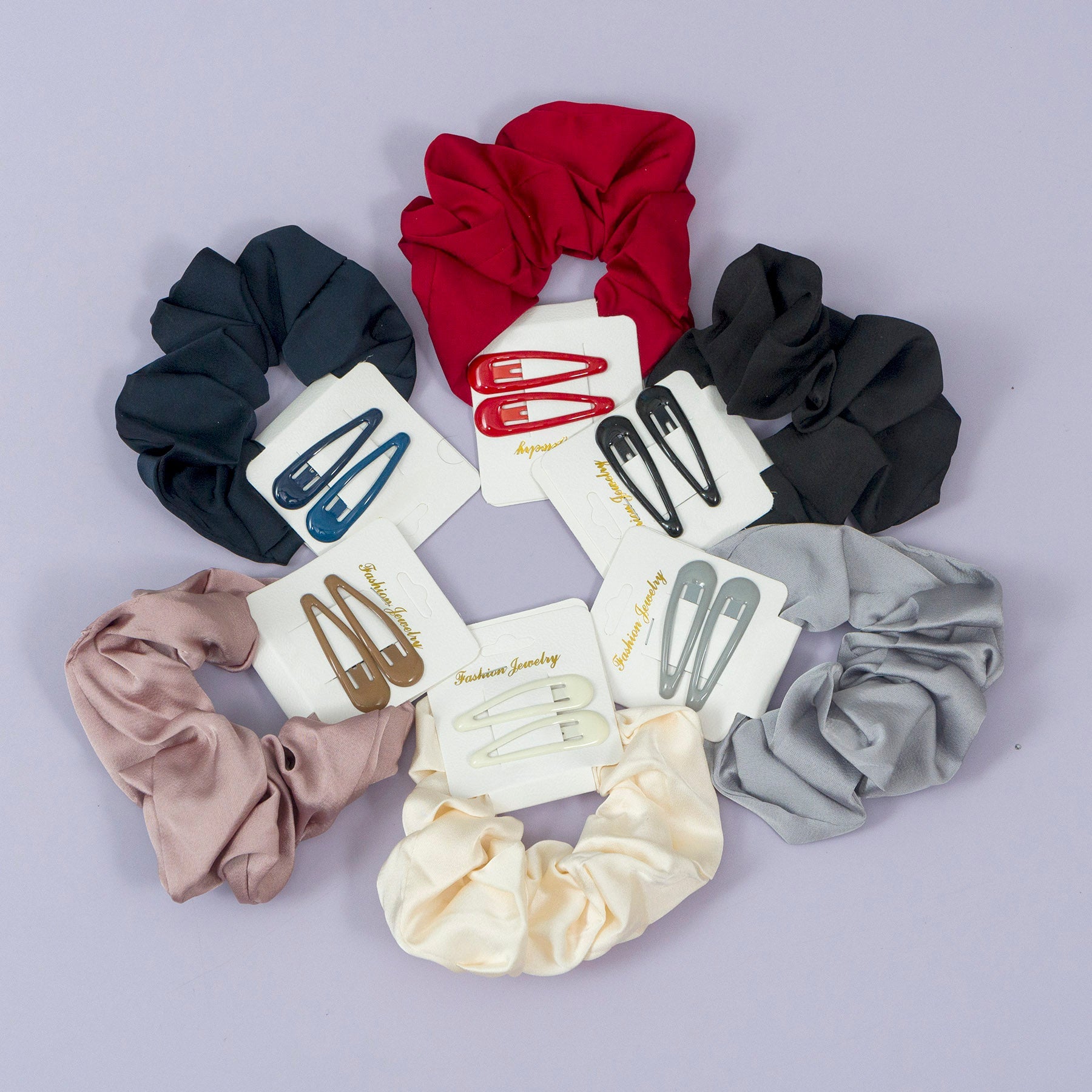 Chic 3-in-1 hair set with 1 satin scrunchie and 2 tic-tac pins. A simple and stylish combo for school, office, or casual everyday use.