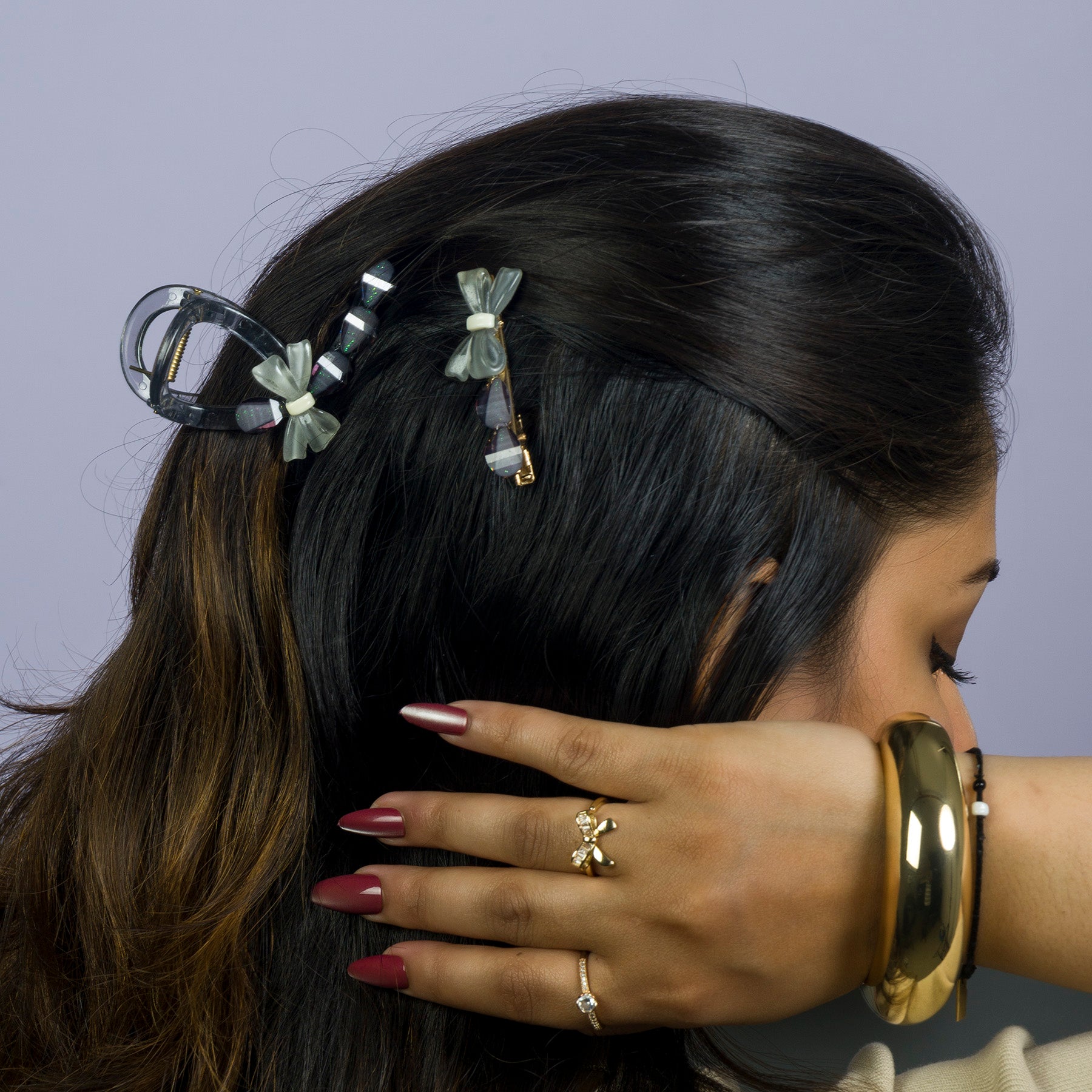 Add a touch of sparkle to your look with our Stone & Charm Hair Claw Set. This stylish combo includes one claw clip with stone and charm detailing, along with two matching pins. Crafted from durable plastic and metal, it’s perfect for everyday elegance or special occasions.